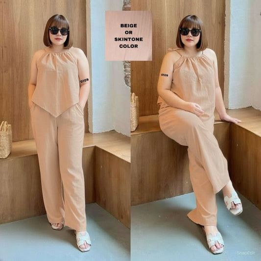 Plus Size Cotton Linen Terno Set – Free Size Fits L to 2XL | Sleeveless Top & Wide-Leg Pants OOTD for Women